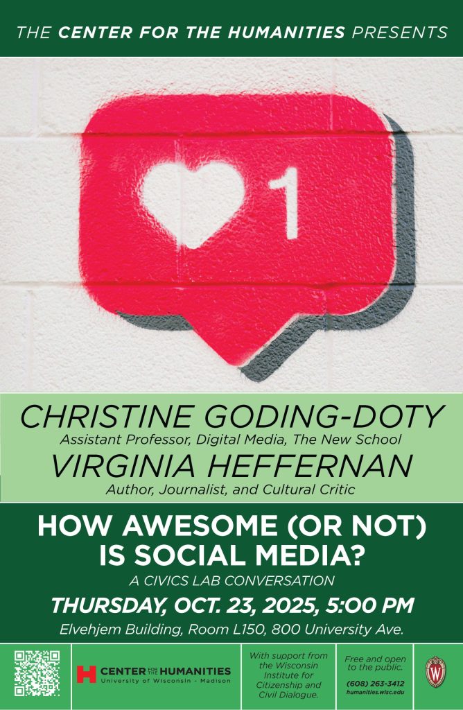 The Civics Lab is supported by a grant from the Wisconsin Institute for Citizenship and Civil Dialogue. Previous speakers in this series include Corey Robin and Musa al-Gharbi as well as a panel discussion, Humanities NOW: Dissent on Campus.